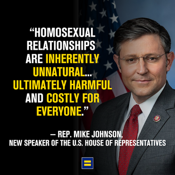 Now more than ever, we need to tap into our broader HRC Team to build collective power and push back against the forces of hate seeking to divide us. Just last week, House Speaker Mike Johnson received an award and gave a keynote address at a Christian nationalist conference, where speakers and other award recipients spread virulent anti-LGBTQ rhetoric and warned of an ongoing “spiritual war” against “demonic” forces.