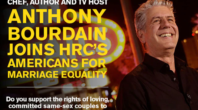 “Anthony Bourdain has spent a lifetime traveling the world in search of the perfect meal,” said HRC spokesperson Charles Joughin. “And while some foods and customs are unique to certain cultures and countries, one theme transcends all borders – love. We are incredibly grateful to Anthony for his commitment to equality and for speaking out in favor of marriage rights for loving gay and lesbian couples nationwide.”