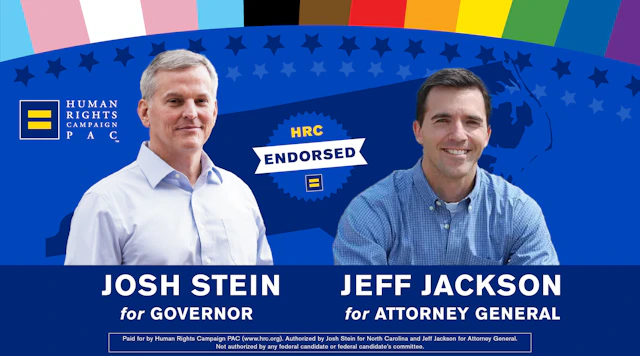 RALEIGH, N.C. — Today the Human Rights Campaign (HRC) PAC, the nation’s largest lesbian, gay, bisexual, transgender and queer (LGBTQ+) civil rights organization, announced its endorsement of Attorney General Josh Stein for Governor of North Carolina and U.S. Rep. Jeff Jackson for Attorney General. Stein is running against Republican gubernatorial nominee Mark Robinson, the current lieutenant governor, who has been brazen and fanatical in expressing his desire to use the levers of government to remove LGBTQ+ people from all parts of public life. Jackson, meanwhile, is running against Republican AG nominee Dan Bishop, the architect of the notorious HB2 that passed in 2016, which launched the discriminatory wave of bathroom bills that in many states now force transgender people into the wrong bathrooms, putting them directly at risk of abuse and physical harm.